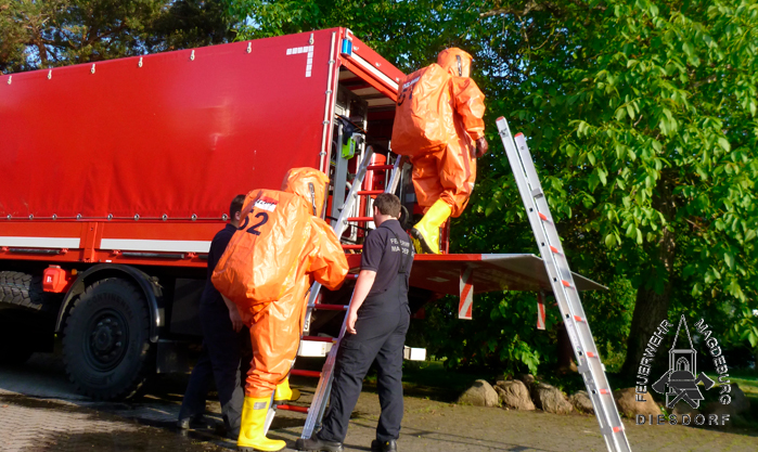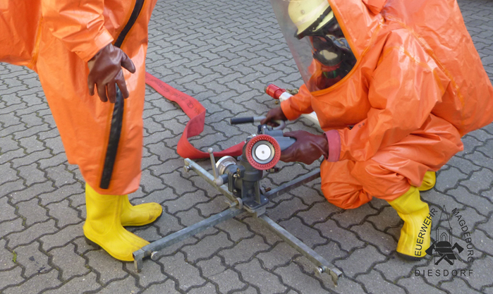 Die Kameraden der Freiwilligen Feuerwehr müssen jährlich, neben ihrer Fitness für Brandeinsätze, auch die Tauglichkeit für ABC- Einsätze nachweisen.