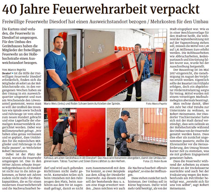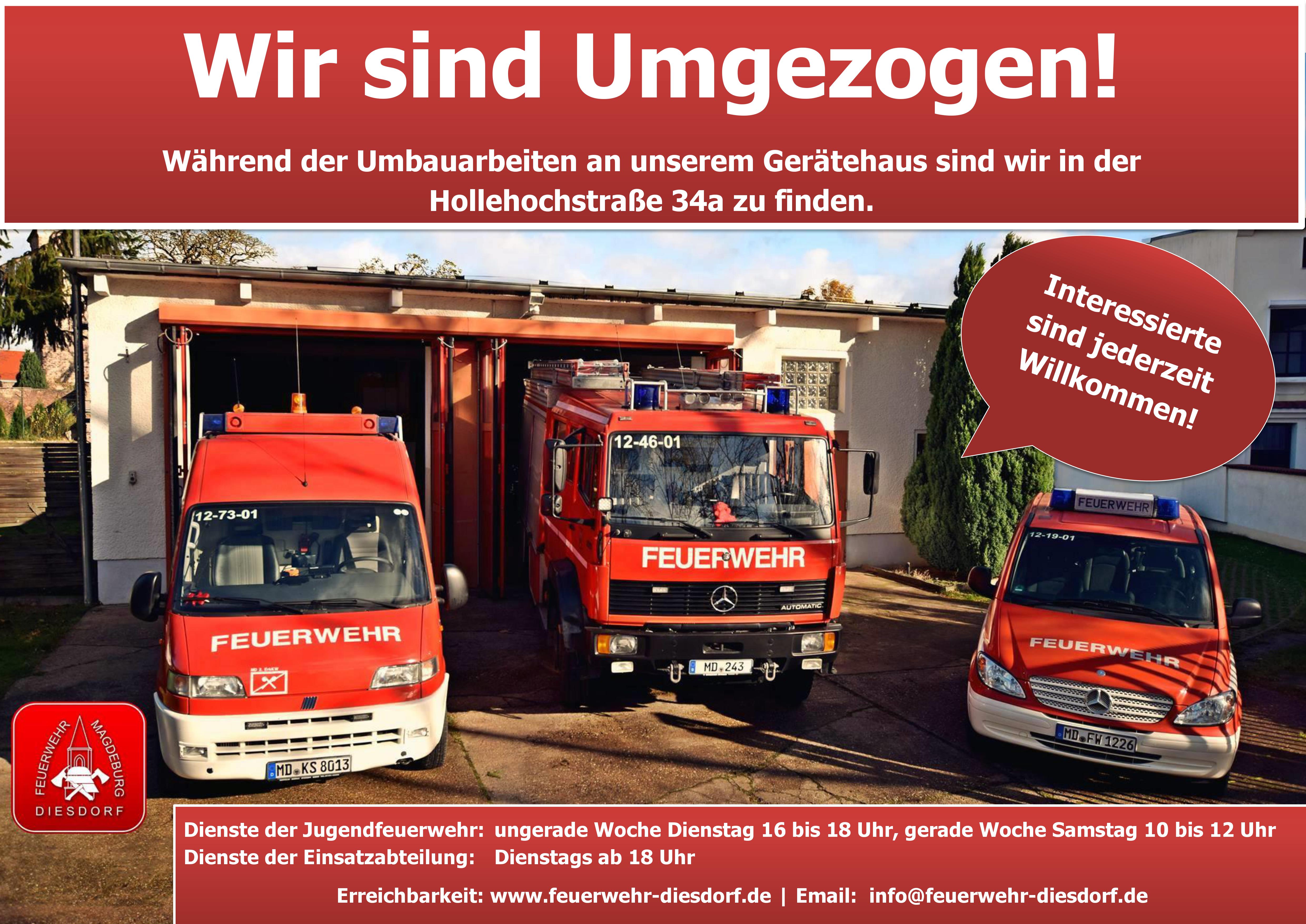 Der Umzug an den Ausweichstandort ist vollbracht. Nun geht der Umbau des Gerätehauses voran, um im Herbst nächsten Jahres im neuen Glanz zu strahlen. Bis dahin ist unsere Wehr vorübergehend auf dem Gelände des Tischlermeisters Olaf Dziuba, in der Hollehochstraße 34a in Diesdorf einquartiert.