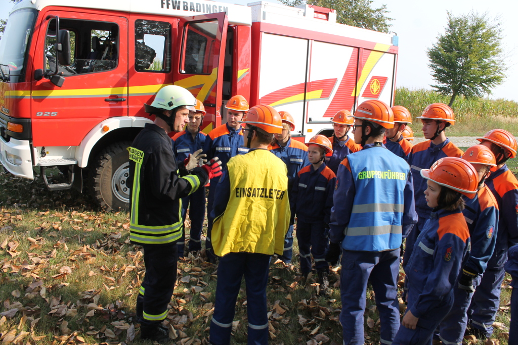 Nach dem Abendbrot saßen die Jugendlichen dann wie auf glühenden Kohlen. Sie waren sehr gespannt, ob es noch einen weiteren Einsatz für sie geben würde. Ständig wurden die Betreuer beobachtet. Vielleicht würde ja doch bald der nächste Alarm ausgelöst. Kurz bevor die Jugendlichen sich für die Nachtruhe vorbereiteten, war es dann soweit. Es gab einen Brandmeldeeinlauf in einer nahegelegenen Grundschule. Nach einer Lageerkundung konnte jedoch kein Handlungsbedarf festgestellt werden. Auf dem Rückweg meldet sich dann aber abermals die „Übungsleitstelle“ mit einem Folgealarm. Auf einem Gehöft mussten eine Katze und ein Huhn nach vorheriger Jagd aus dem Baum gerettet werden. Ebenso wurden zwei Personen vermisst, die nach dem Suchen der Tiere nicht wiederkehrten. In tiefer Dunkelheit musste nach ihnen gesucht werden. Recht zügig wurde die Beleuchtung sowie die Leiter aufgebaut, um die Tiere aus dem Baum zu retten, und auch die Personen waren bald gefunden. Die Aufräumarbeiten zogen sich aufgrund der nun herrschenden Müdigkeit für einige wie Kaugummi und auf der Rückfahrt zur Unterkunft schlief der ein oder andere bereits im Fahrzeug tief und fest ein. Somit endeten zwei ereignisreiche Tage. Unsere Jugendliche werden dieses Wochenende in guter Erinnerung behalten. So freute sich der eine über die Zusammenarbeit mit anderen Feuerwehren und der andere darüber, dass er mal löschen durfte. Auch die realitätsgetreue Nachstellung z. B. der Verletzungen, Ölspur und Einsatzstellen wird einen bleibenden Eindruck bei uns hinterlassen. Gemeinsame Folgeveranstaltungen mit den Feuerwehren wurden bereits in Erwägung gezogen.