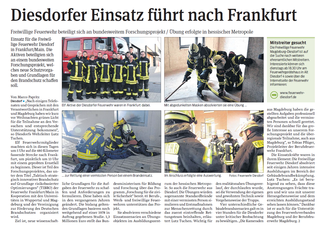 Forschungsprojekt in Frankfurt a. M. Im Februar war die Feuerwehr Magdeburg - Diesdorf Teilnehmer des nationalen Forschungsprojektes TIBRO in Frankfurt a. M. Vorheriger Beitrag: Ausbildung mit der FF Olvenstedt Zurück Nächster Beitrag: Gründung des Fördervereins Weiter