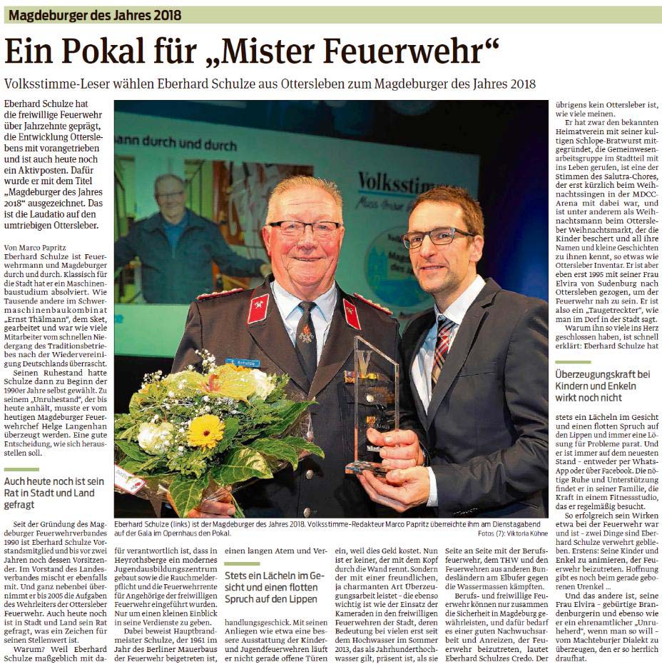 Freudestrahlend nahm Eberhard Schulze, langjähriges Mitglied im Magdeburger Feuerwehrverband, seine Auszeichnung als Magdeburger des Jahres 2018 entgegen. Die Freiwillige Feuerwehr Magdeburg-Diesdorf war bei der Verleihung vor Ort und gratulierte dem verdienten Gewinner herzlich.
