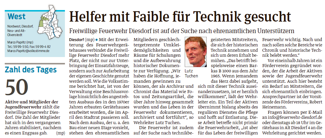 Chronisten und Techniker gesucht Wir suchen nicht nur neue Einsatzkräfte, sondern auch Menschen, die sich für die Historie des Feuerwehrwesens und unsere alte Technik interessieren. Vorheriger Beitrag: Mitgliederversammlung des Fördervereins Zurück Nächster Beitrag: Umbau des Gerätehauses Weiter