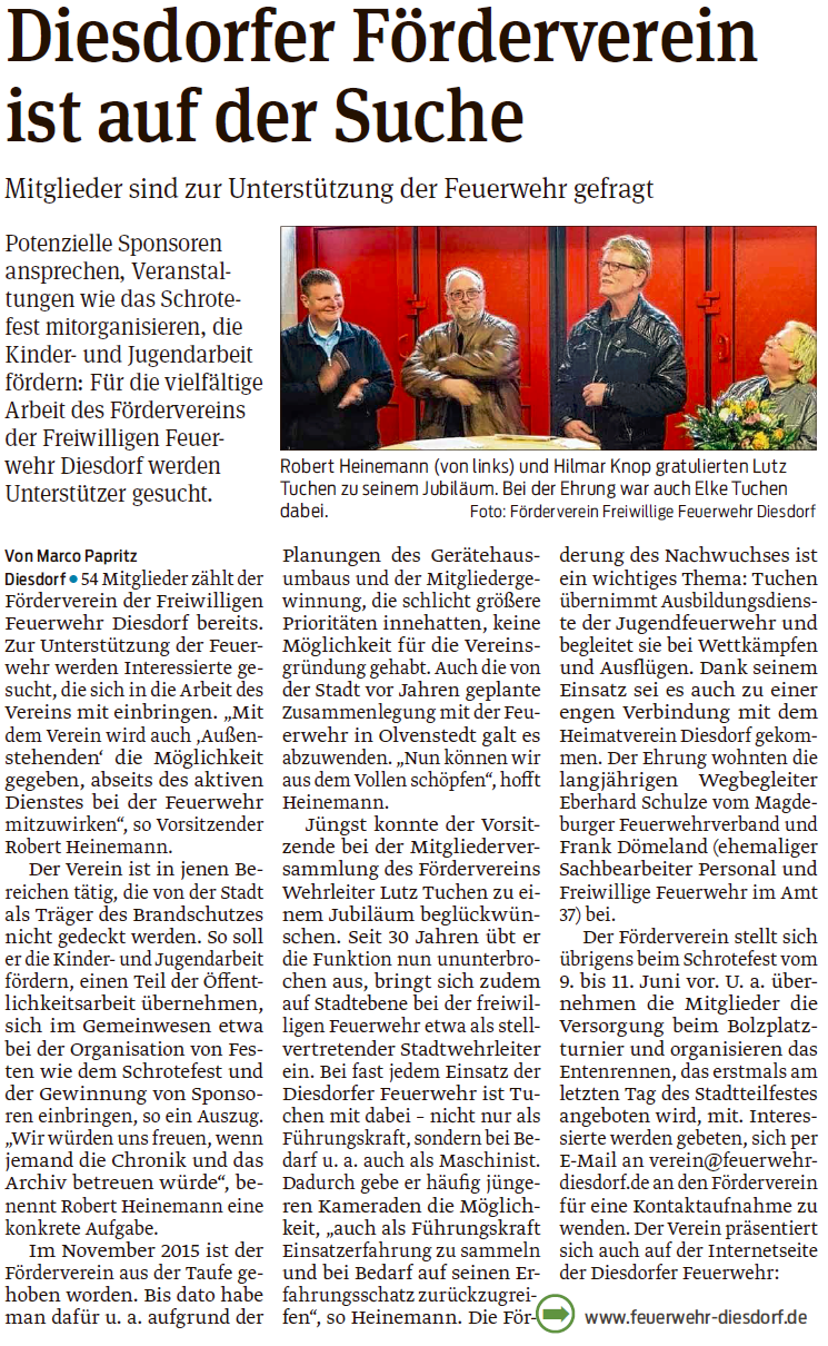 Dabei wurden nicht nur die Bemühungen des Vereins im letzten Geschäftsjahr den mittlerweile 54 Mitgliedern vorgestellt, sondern auch das geplante Engagement für das laufende Jahr diskutiert. So wird es unter anderem eine Unterstützung des Bürger- und Heimatvereins Diesdorf bei der Durchführung des alljährlichen Schrotefestes geben, aber selbstverständlich auch die Förderung der Arbeit der Einsatzabteilung und Jugendfeuerwehr bei uns in Diesdorf. Nach dem offiziellen Programm wurde der Tag in gemütlicher Runde, mit Speis und Trank, ausklingen gelassen.