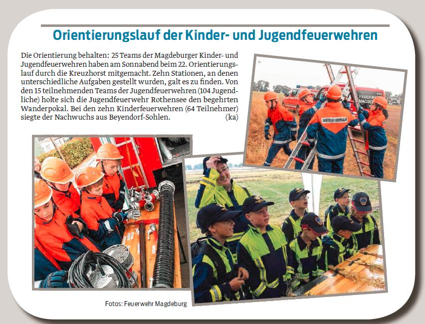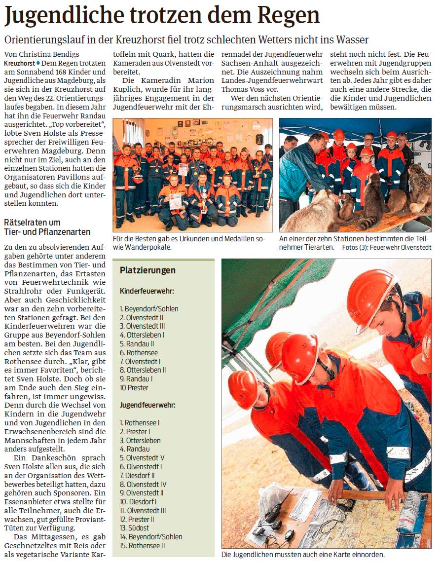 Jugendfeuerwehr beim Orientierungslauf Unsere Jugendlichen haben erfolgreich am Orientierungslauf der Jugendfeuerwehren der Stadt Magdeburg teilgenommen.Lesen Sie hier, was die Volksstimme darüber berichtet. Vorheriger Beitrag: Jugendliche üben wie die Profis Zurück Nächster Beitrag: Feuerwehr unterstützt bei Filmarbeiten Weiter