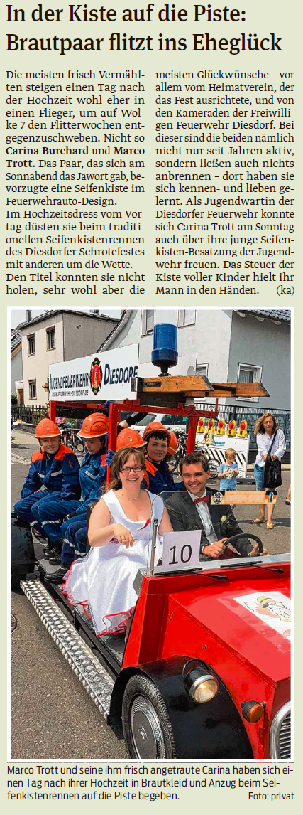 Auch im Jahr 2016 hat unsere Feuerwehr den Bürger- und Heimatverein Magdeburg-Diesdorf tatkräftig bei der Durchführung des Schrotefestes unterstützt. Die Einsatzabteilung sicherte – wie auch in den vergangenen Jahren – am Sonnabend das Entenrennen ab. Am Sonntag wurde die Strecke für das Seifenkistenrennen aufgebaut und diese während des Rennens abgesichert. Die Jugendfeuerwehr startete mit der eigenen Seifenkiste und belegte den siebten Platz. Die Besucher konnten sich bei selbstgebackenen Leckereien in unserem Gerätehaus stärken und die Fahrzeuge besichtigen und erklären lassen.