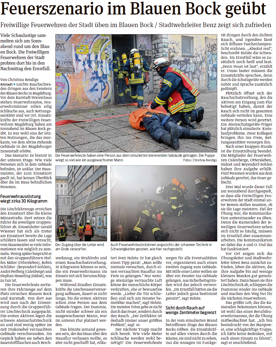Stadtübung im "Blauen Bock" Am 07.11.2015 haben alle freiwilligen Feuerwehren der Stadt Magdeburg eine Großübung im Blauen Bock absolviert. Die Volksstimme hat darüber ausgiebig berichtet: Vorheriger Beitrag: Blutspende zahlt sich doppelt aus Zurück Nächster Beitrag: Schrotefest 2015 Weiter