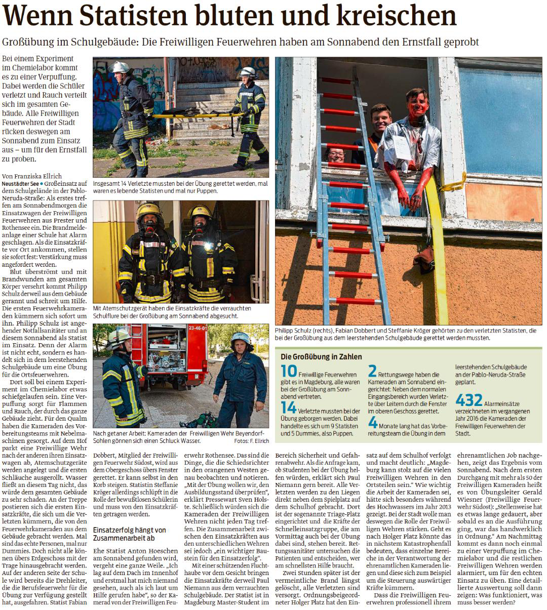 Ein missglücktes Chemieexperiment in einer Schule in Magdeburg-Neustadt war Grund für ein Großaufgebot der Freiwilligen Feuerwehren Magdeburgs. Doch erfreulicherweise handelte es sich hier um eine Übung an einem Samstag in einem leerstehenden Schulgebäude... :