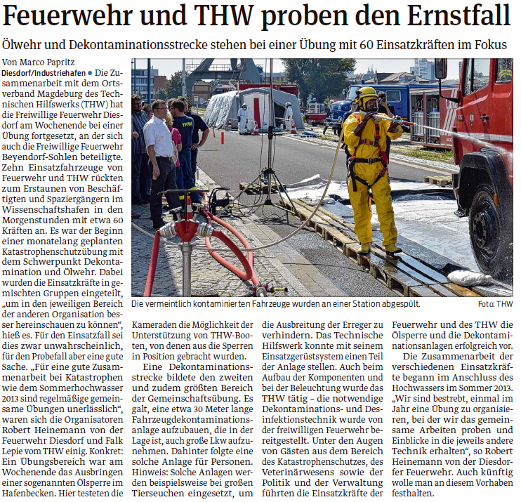 Die Feuerwehren aus Diesdorf und Beyendorf-Sohlen haben eine gemeinsame Ausbildung mit dem ansässigen THW-Ortsverband durchgeführt. Thema waren die Errichtung einer Dekontaminationsstrecke zru Seuchenbekämpfung sowie die Ölbekämpfung auf der Elbe