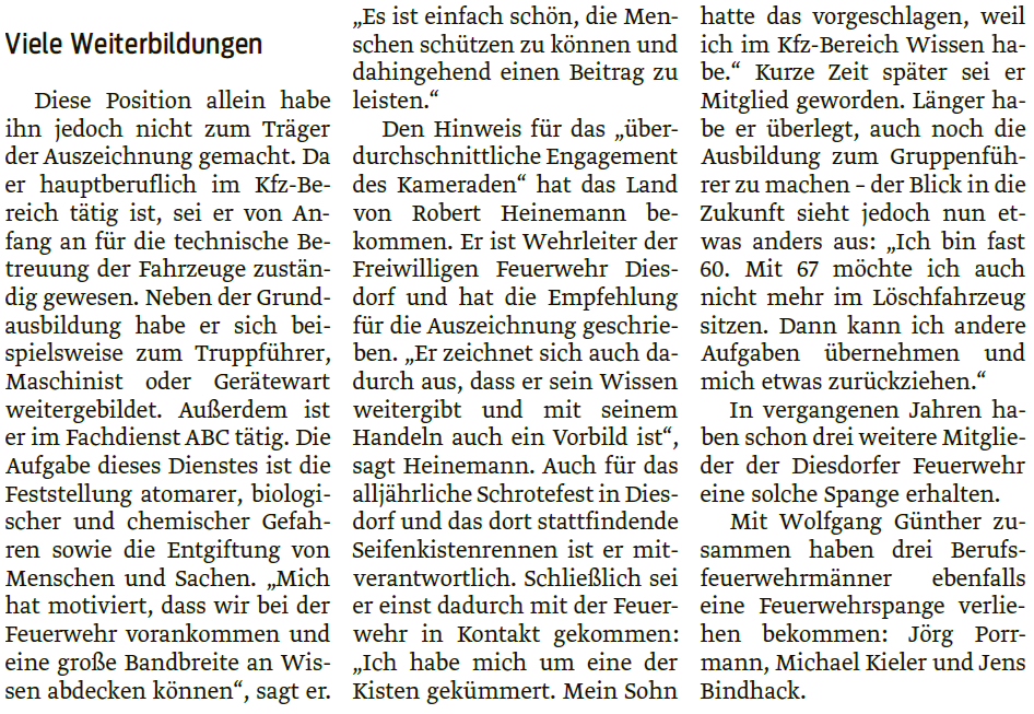 Dort wurde ihm für seine zeitintensive ehrenamtliche Tätigkeit in der Freiwilligen Feuerwehr und seiner hohen Einsatzbereitschaft gedankt.